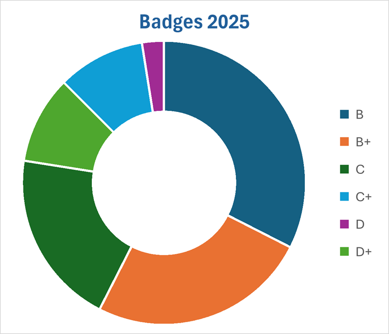More than half of the participants received a B or B+ score placing them at manager level. Almost one third received a C or C+ badge therefore corresponding to pursuer level. Even those at beginner level demonstrated a strong determination to contribute to the broader sustainable rail vision. The proportion of participants achieving RSi manager level has doubled compared with RSi 2022. Meanwhile, the beginner level, nearly half of all participants in RSi 2022, was reduced fourfold in 2025, with most progressing into the continuing and executive levels.